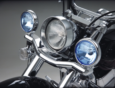 Ce 4-1/2 "le diamètre le contour de lentille bleu conduisant des feux vient avec une 50 lumière d'halogène de Watt, aussi bien que, une barre légère, montant le plat, montant le matériel, le harnais de fil, le commutateur et le relais. La lentille bleue donne un impact visuel distinctif de lumière blanche brillante. Les kits viennent sans encarts de transfert de clignotant. For VT750 Ace; VT1100 Sabre & Aero